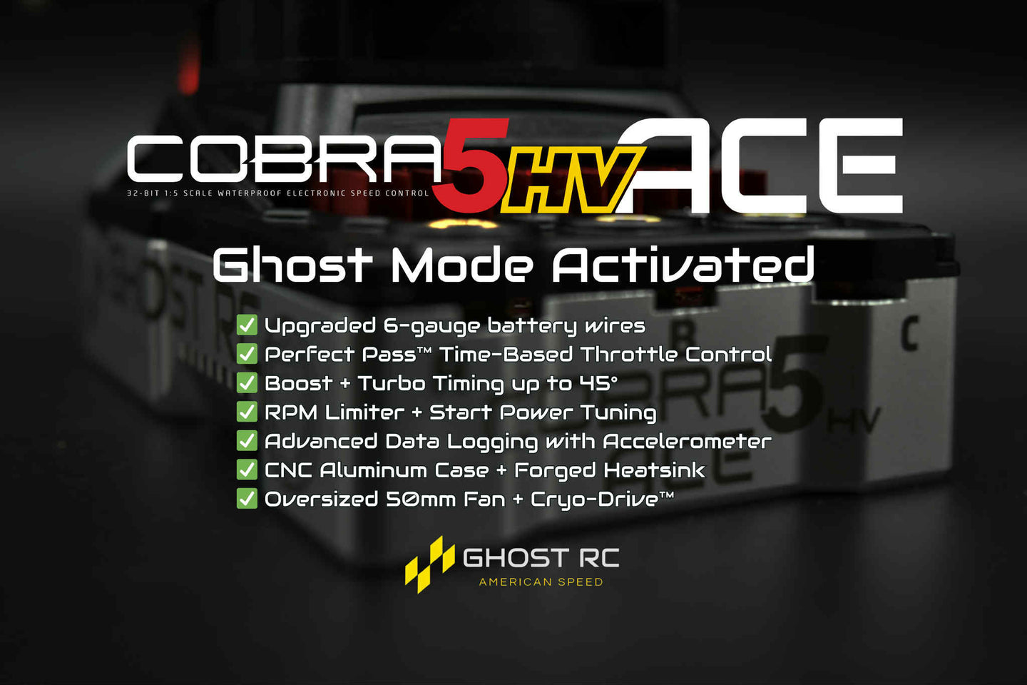 Castle is excited to continue our partnership with Ghost RC, in association with Perfect Pass, to introduce the Cobra 5 HV ACE. Based on Castle's new Cobra 5 HV ESC, the Ghost RC Cobra 5 HV ACE was designed for the extreme demands of 1/7th scale drag racing and high-speed applications.